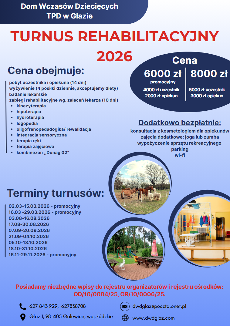 Dom Wczasów Dziecięcych TPD w Głazie na podstawie wpisu do rejestru ośrodków (nr:OD/10/0004/25 ważny do dnia 09.08.2028) wydanego przez Wojewodę Łódzkiego uzyskał prawo do organizowania następujących turnusów rehabilitacyjnych: